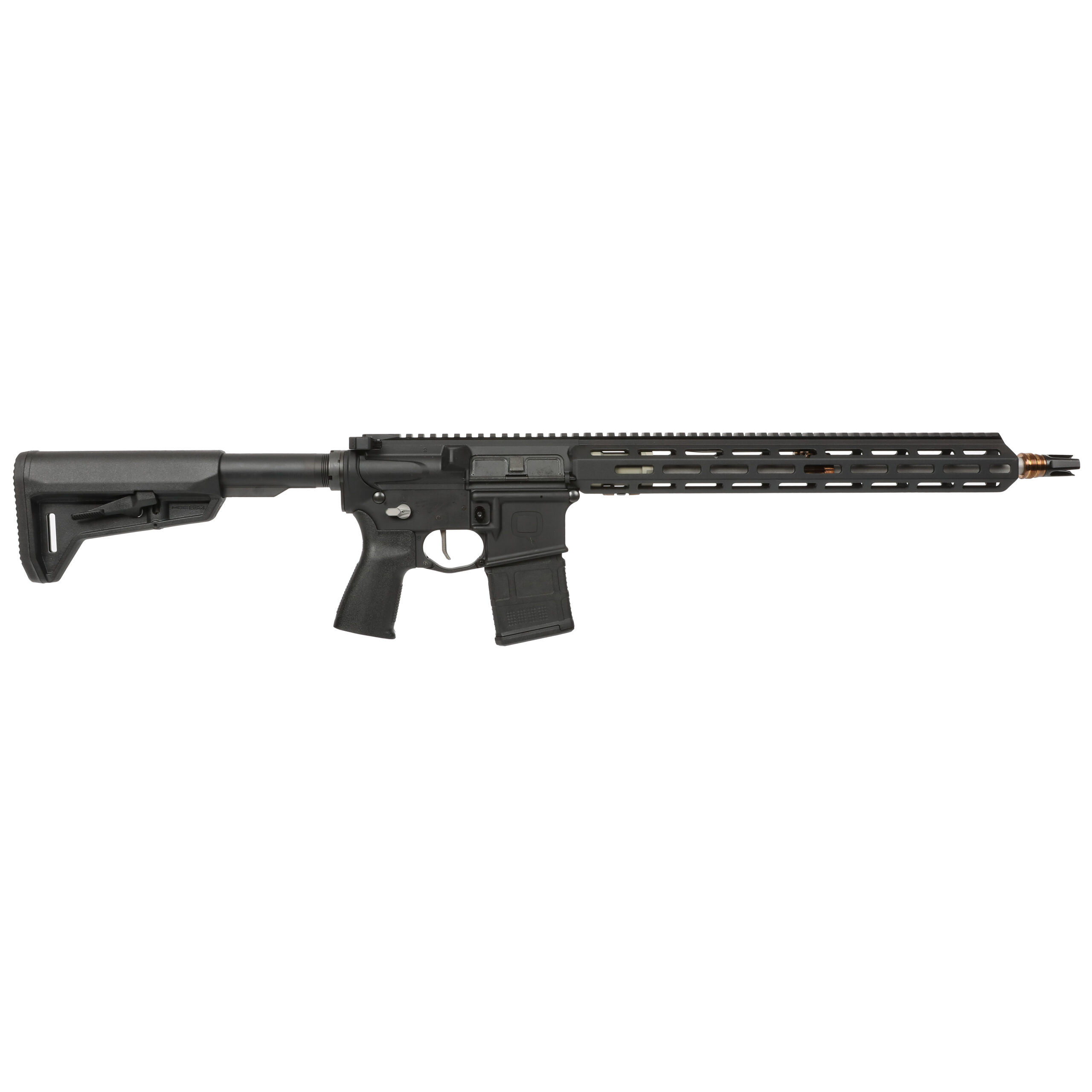 It’s built on a clear anodized M16 spec receiver set (no forward assist), and features a fast-twist barrel, Cherry Bomb muzzle brake, adjustable gas block, and 15-inch M-LOK handguard that are the same as the higher priced Honey Badger. It uses a 6-position receiver extension (AKA “buffer tube”) that houses a carbine length action spring and buffer, and is topped off with a MOE SL-K Carbine Stock.