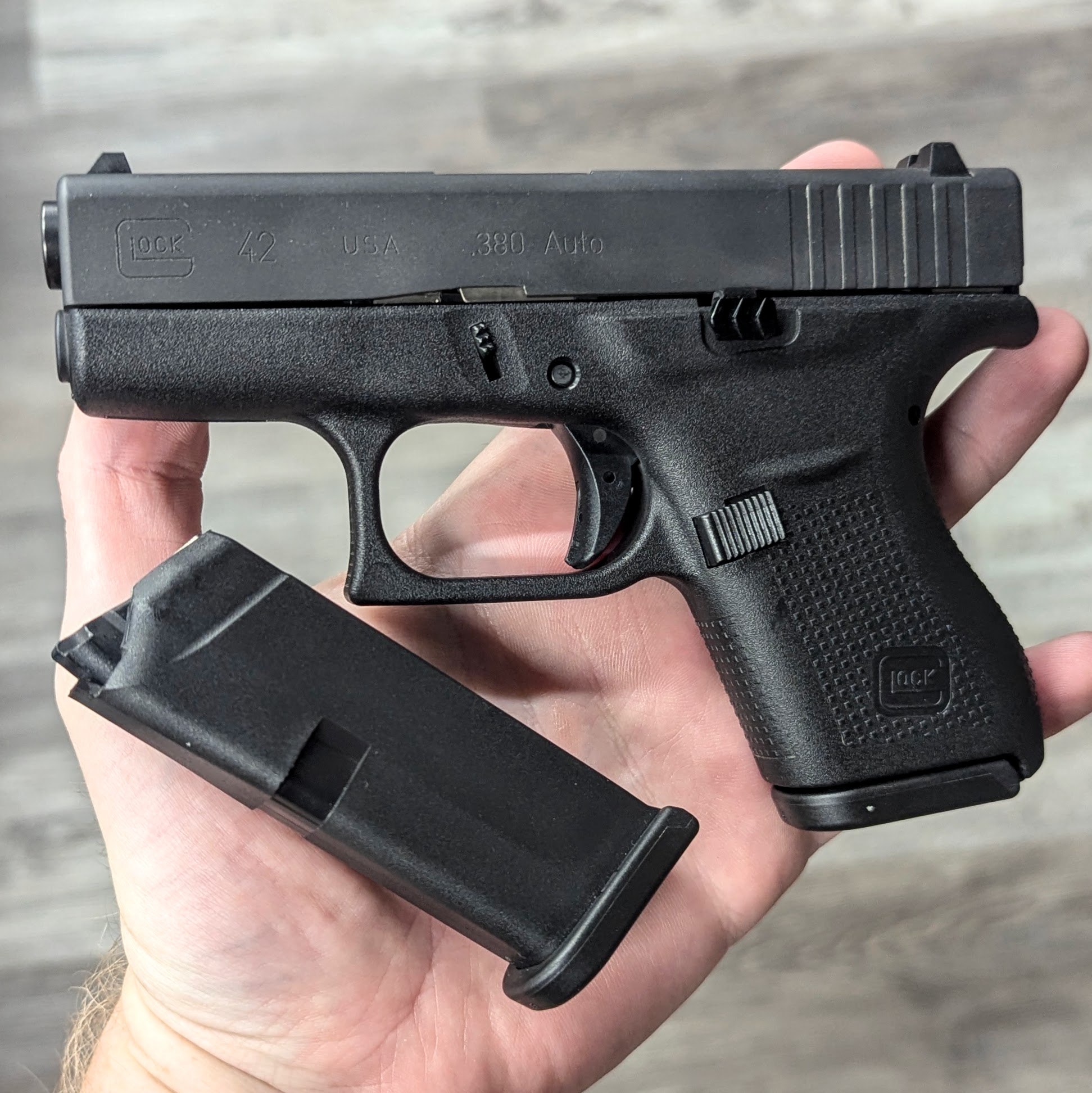The Glock 42 is the smallest GLOCK possible with ultra-compact dimensions and easy-to-shoot characteristics. It features Glock’s Safe Action system which provides a consistent trigger pull from the first to the last round. The three automatic independently operating mechanical safeties are built into the fire control system of the pistol. All three safeties disengage sequentially as the trigger is pulled and automatically reengage when the trigger is released. The frame is made of polymer with hardened steel guides. It features an ideal grip angle and low weight. The slide stop lever and the magazine catch are easily operated with the shooting hand. The advanced surface treatment of the slide results in optimal hardness by considerably reducing wear and tear and it makes it corrosion resistant, even when operating in saltwater conditions. The matte surface minimizes light reflection. The barrel is mechanically locked and cold-hammer forged. It also has the same advanced surface treatment as the slide. Its extractor serves as a loaded chamber indicator to comply with the laws of certain states and its position may visually and physically indicate whether there is a cartridge in the chamber of the pistol.